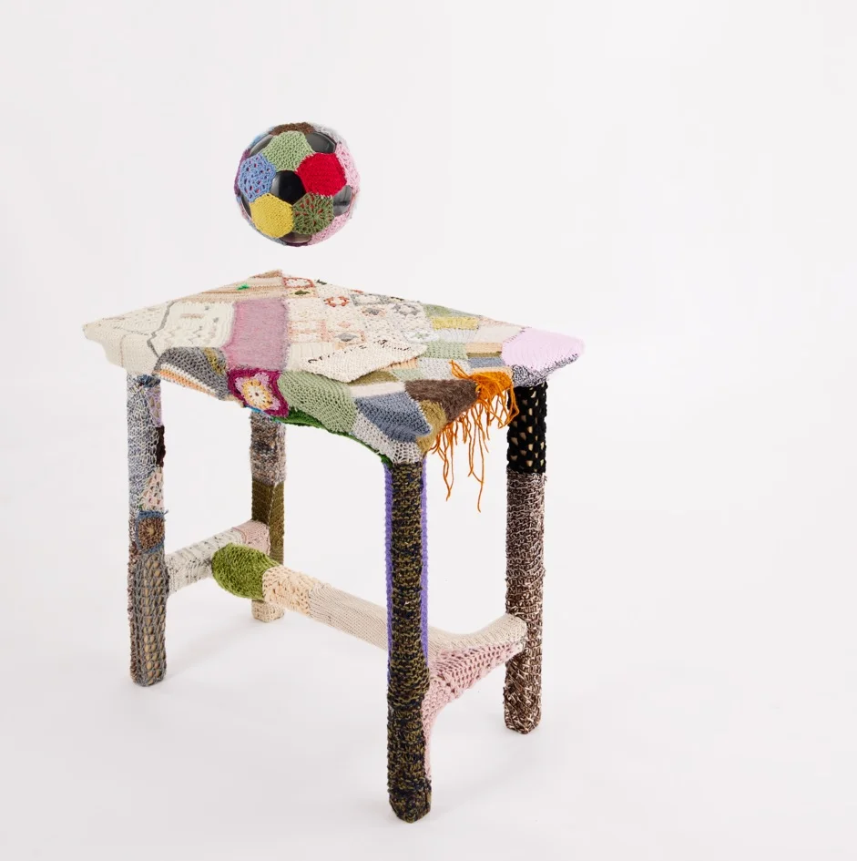 ‘not enough of us around the table, or in the game’ depicts a football and table that has been covered in knitting by a group of Southampton residents, and which considers the experience of being a woman in the city.